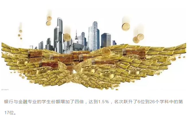 银行与金融专业的学生份额增加了四倍,达到1.5%,名次跃升了6位到26个学科中的第17位。