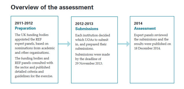REF评估结果每7年发布一次,最近的REF结果于2014年公布,替代了以前RAE( Research Assessment Exercise)的称谓。REF 2014一共对36个学科分支,154所英国高校研究机构进行评估调查。